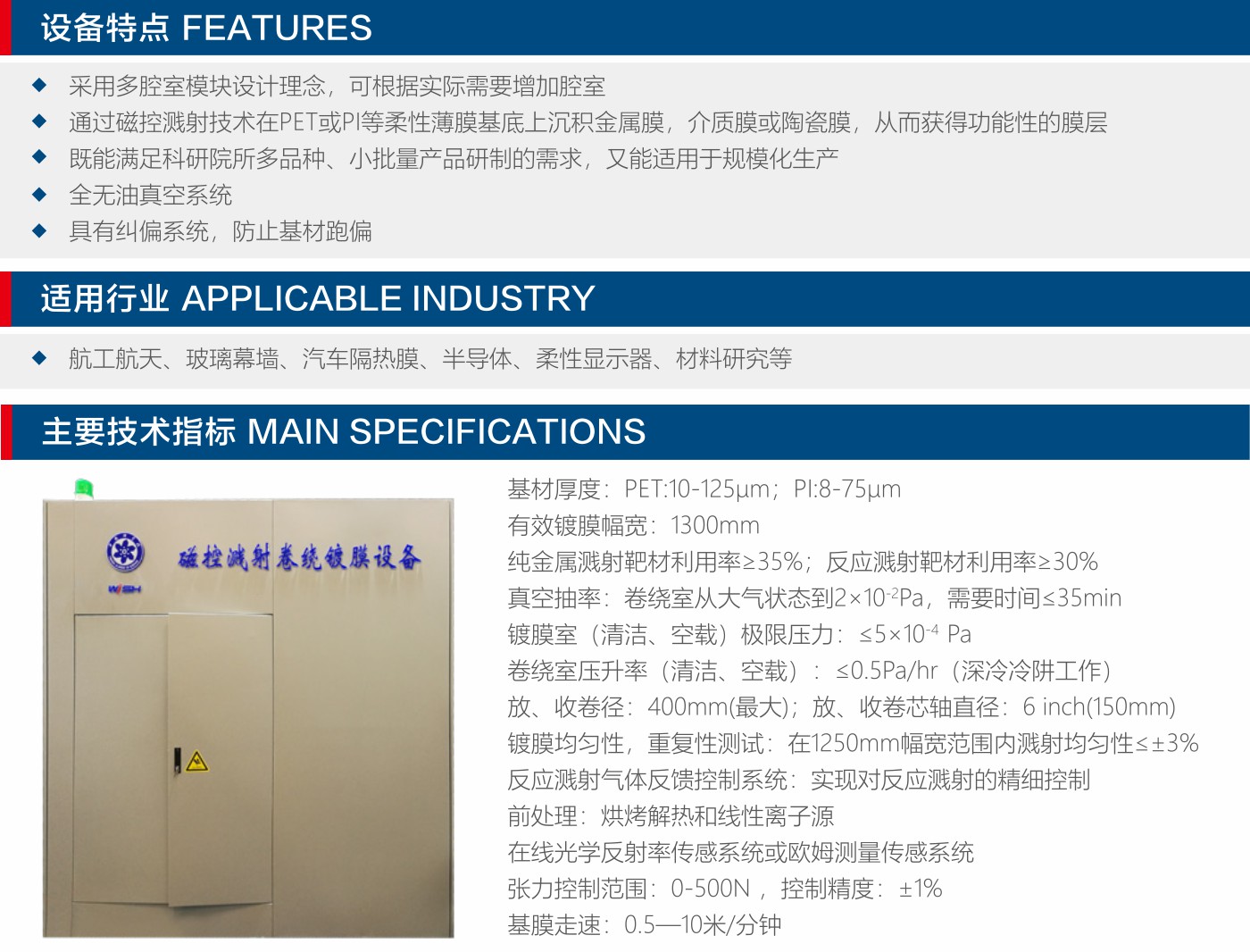 適用行業(yè):航工航天、玻璃幕墻、汽車(chē)隔熱膜、半導(dǎo)體、柔性顯示器、材料研究等。