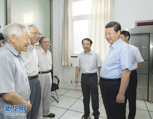 7月17日,中共中央總書記、國家主席、中央軍委主席習(xí)近平到中國科學(xué)院考察工作。這是習(xí)近平同當(dāng)年參與北京正負(fù)電子對(duì)撞機(jī)建設(shè)和應(yīng)用的3位院士交談。新華社記者 李學(xué)仁 攝